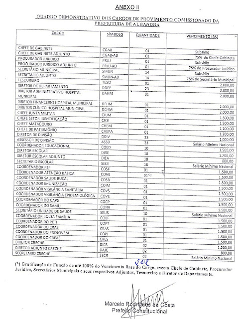 O novo prefeito tenta anular um concurso público realizado na cidade em 2010, com isso, a Prefeitura de Alhandra demitiria os 203 aprovados. Ao mesmo tempo, Marcelo Rodrigues tenta criar 202 novos cargos no município em projeto enviado à Câmara Municipal. As gratificações dos cargos que a prefeitura pretende criar pode, de acordo com o projeto, dobrar os salários dos contratados.